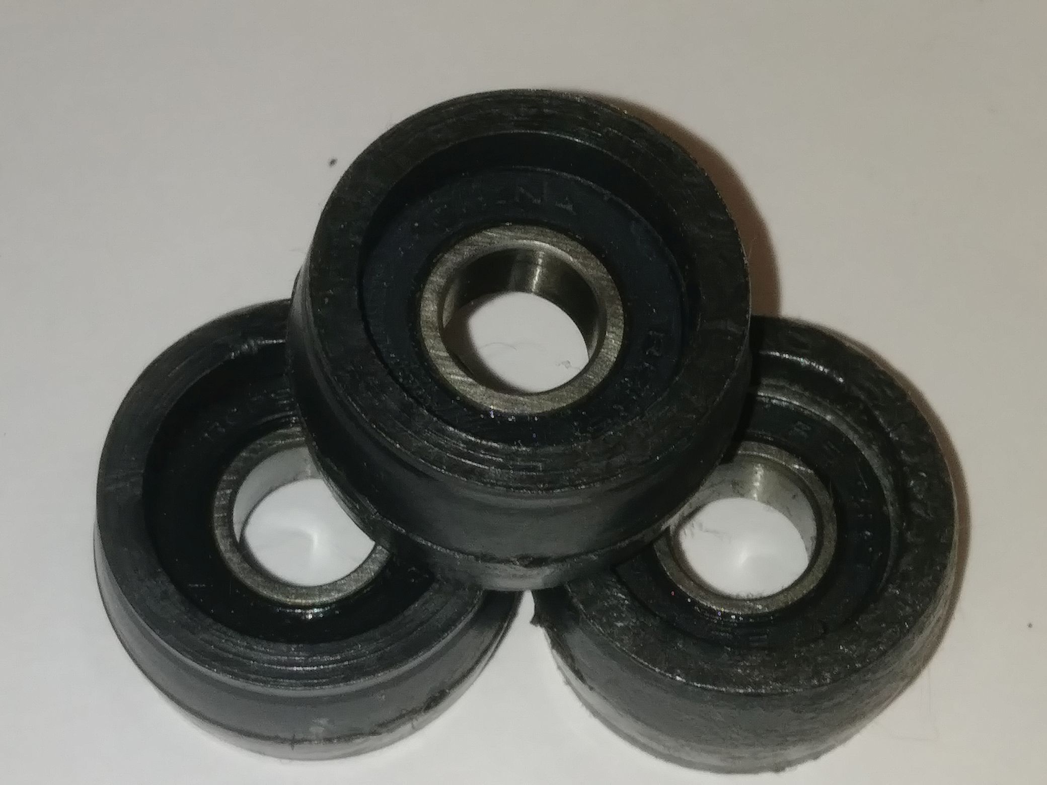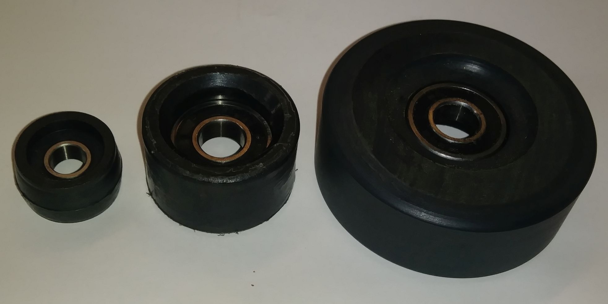 We manufacture a small variety of polymer wheels. Those shown are made of molybdenum filled nylon and are about one to three inches in diameter.